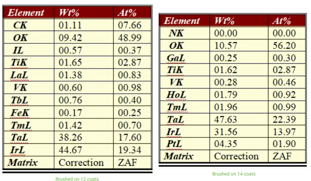 Ehisen’s R & D team has been engaged in the research of titanium anode coating process for more than ten years. Through thousands of experiments, it has been found that for most industrial application scenarios, the number of coating applications between 10 and 16 times can achieve better comprehensive performance. Among them, 12 and 14 coating applications are two typical process parameters. The following will focus on the energy spectrum detection results of these two times of coating applications to analyze their performance differences.